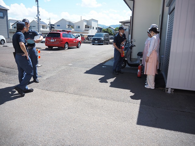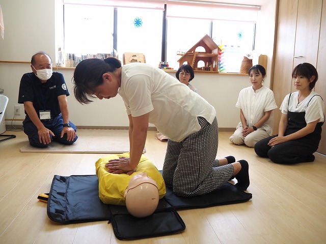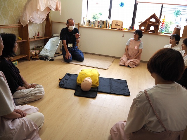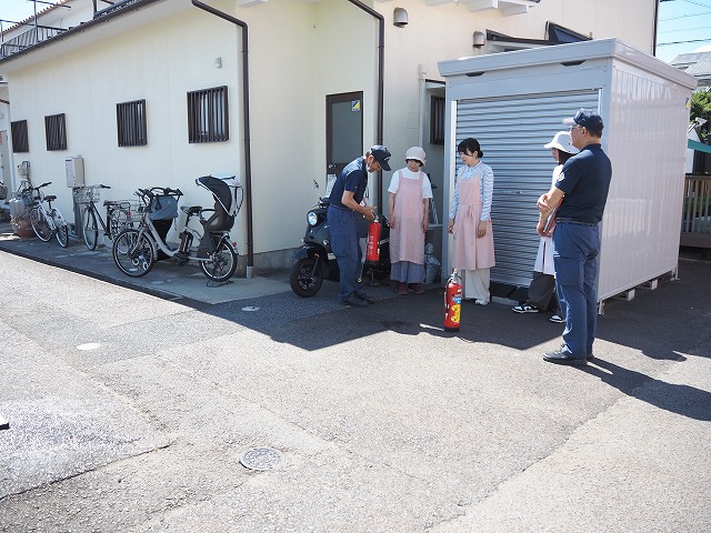🚒毎年消防士さんに来て頂き、小さなお子さん対象の救急救命講習をスタッフ全員3時間受けています。毎年受けることで忘れていたことや新たに気づくこともあり、定着を目指しています。また、毎月避難訓練を実施していますが、年1回消防士さんによる消火訓練を実施しています。本番さながら非常ベルを鳴らし、実際に119番通報します。水消火器を使い消火器の使い方も習います。子どもたちの安全を守る為毎年行なっていきます。