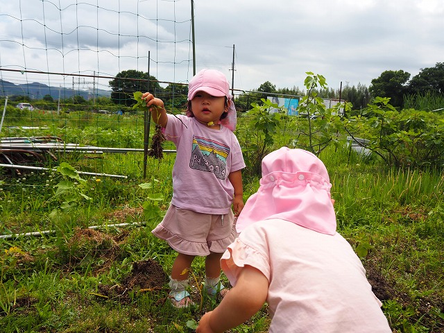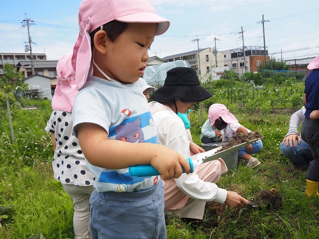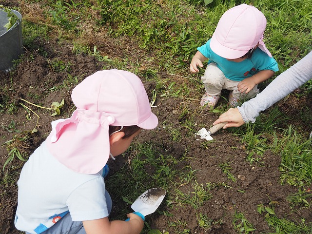 「大きいな、これは小さい!」と大きさを比べたり、土の中にもぐっている虫さんも探して楽しんでいました。
