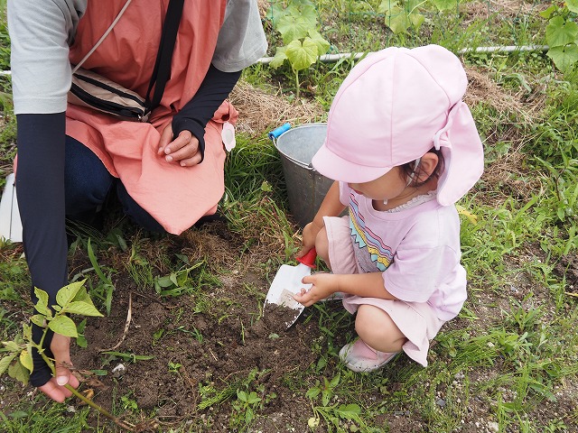 「やったー!」と満面の笑顔!一通りつるを引っ張った後も土を掘るとお芋が出てきます。子どもたちは、「こっちにもあるよ~」「あっちにもあるよ~」と小さな手で一生懸命あちこち掘っては、お芋を見つけて喜んでいました!まだまだ出てくるお芋に私たちも夢中になって砂だらけになりながらみんなで掘り起こしていました!小さなお友だちもミミズや幼虫さんに目を丸くしたり、スコップを持って砂遊びを楽しんでいましたよ。11月の土曜日の家族行事「焼き芋」を子どもたちとても楽しみにしています!枝豆もたくさん収穫しました。各家庭へお土産に持って帰ってもらいました。